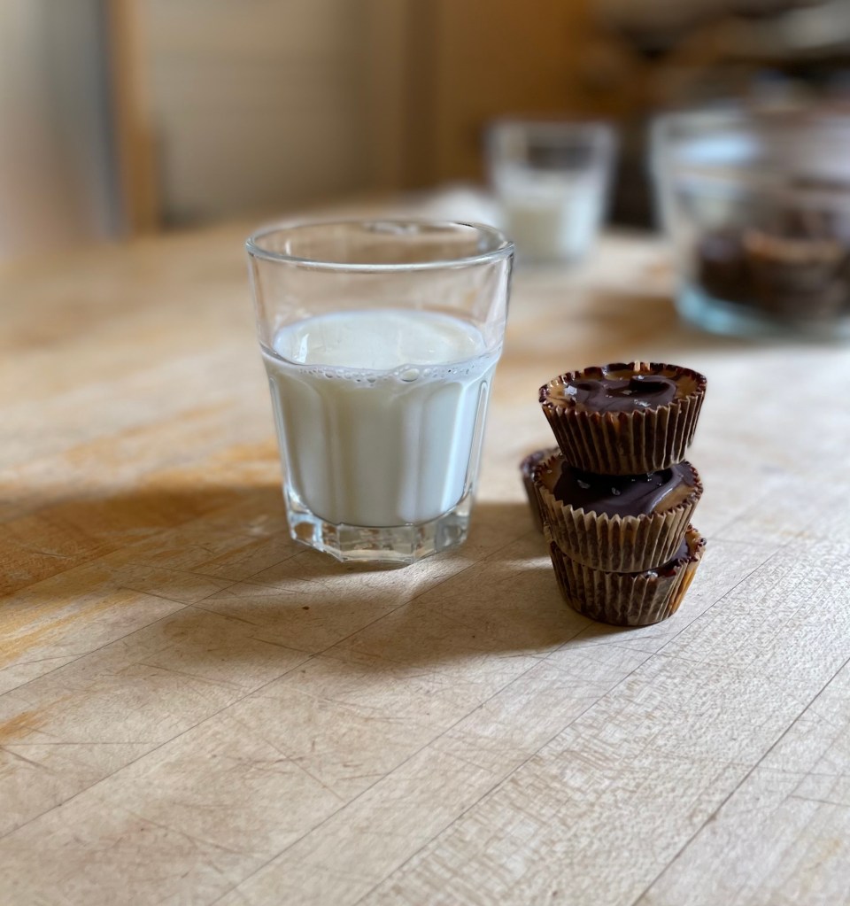 Melt the remaining chocolate like you did before, then spoon it on top of the peanut butter. Smooth it down if necessary and freeze for about 25 minutes. When they’re ready, sprinkle with flaky sea salt and eat one or seven with milk. Store in the fridge.